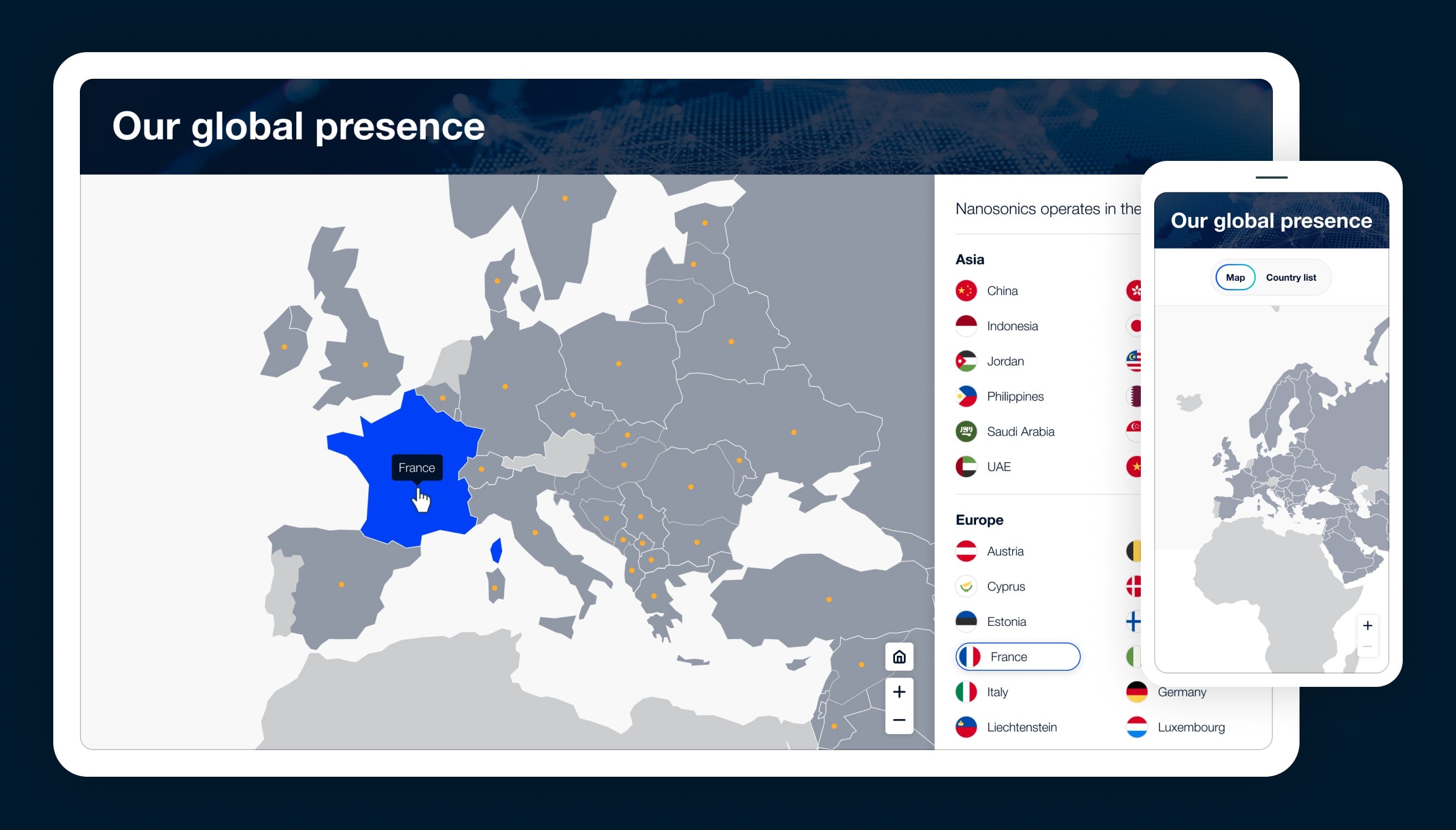 It's not always suitable to display a cluster of pins for each location. Sometimes you need to visually convey your global reach as a company, on a world-scale map. In this example we utilised darker tones to illustrate the countries Nanosonics operate in. Both the map, and the list of countries, can be interacted with to reveal additional information.